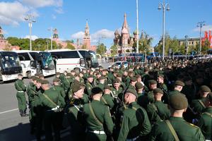 (250509) — MOSCU, 9 mayo, 2025 (Xinhua) — Militares se preparan para asistir a un desfile militar con motivo del 80º aniversario de la victoria en la Gran Guerra Patriótica de la Unión Soviética, en Moscú, Rusia, el 9 de mayo de 2025. (Xinhua/Bai Xueqi) (jg) (da) (vf)
