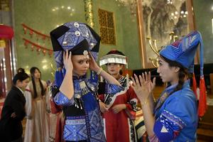 (250421) -- MOSCU, 21 abril, 2025 (Xinhua) -- Imagen del 20 de abril de 2025 de estudiantes probándose trajes étnicos chinos en el evento del Día Internacional del Idioma Chino 2025, en Moscú, Rusia. (Xinhua/Alexander Zemlianichenko Jr) (oa) (ah) (ce)