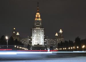 (251117) -- MOSCU, 17 noviembre, 2025 (Xinhua) -- Imagen del 10 de noviembre de 2025 de una vista nocturna del edificio principal de la Universidad Estatal de Moscú, en Moscú, Rusia. Moscú es el centro político, económico, cultural y tecnológico de Rusia. (Xinhua/Hao Jianwei) (oa) (ah) (vf)