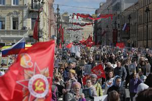 (250510) -- SAN PETERSBURGO, 10 mayo, 2025 (Xinhua) -- Imagen del 9 de mayo de 2025 de personas participando en el desfile del "Regimiento Inmortal" con fotografías de veteranos en las manos para conmemorar el 80º aniversario de la victoria en la Gran Guerra Patriótica de la Unión Soviética, en San Petersburgo, Rusia. (Xinhua/Irina Motina) (jg) (da)