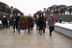 (250128) -- SAN PETERSBURGO, 28 enero, 2025 (Xinhua) -- Imagen del 27 de enero de 2025 de personas llevando una corona y ramos de flores en homenaje a las víctimas que murieron durante el Sitio de Leningrado en el cementerio conmemorativo de Piskarevskoye, en San Petersburgo, Rusia. La ciudad rusa de San Petersburgo conmemoró el lunes el 81° aniversario del levantamiento del Sitio de Leningrado con una serie de eventos solemnes, incluidas ceremonias de colocación de ofrendas florales, exposiciones temáticas y vigilias con velas. (Xinhua/Irina Motina) (jg) (ra) (vf)