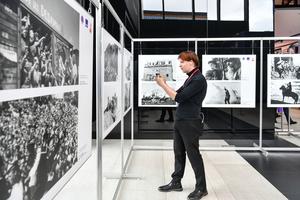 (250620) -- SAN PETERSBURGO, 20 junio, 2025 (Xinhua) -- Imagen del 19 de junio de 2025 de un visitante tomando fotografías en una exposición fotográfica con motivo del 80º aniversario de la victoria en la Guerra Mundial Antifascista, en San Petersburgo, Rusia. Bajo el título "Méritos inmortales, memoria eterna", la exposición fue organizada conjuntamente por la Agencia de Noticias Xinhua y la agencia de noticias TASS. (Xinhua/Cao Yang) (rtg) (ra) (ce)