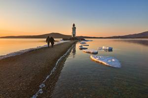 (260310) -- VLADIVOSTOK, 10 marzo, 2026 (Xinhua) -- Imagen del 9 de marzo de 2026 de personas caminando hacia el Faro Tokarevsky al amanecer, en Vladivostok, Rusia. (Xinhua/Andrey Matveenko) (ah) (ce)