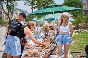 (250627) -- VLADIVOSTOK, 27 junio, 2025 (Xinhua) -- Turistas compran recuerdos en la calle, en Vladivostok, Rusia, el 27 de junio de 2025. Vladivostok experimentó una severa ola de calor el viernes. (Xinhua/Guo Feizhou) (oa) (ra) (ce)