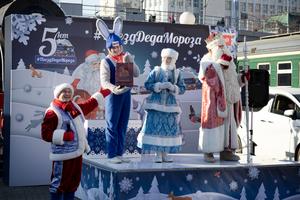 (251119) — VLADIVOSTOK, 19 noviembre, 2025 (Xinhua) — Actores interpretan los papeles del «Padre Escarcha» y «La Doncella de Nieve» mientras realizan una presentación junto a otros actores, en Vladivostok, Rusia, el 19 de noviembre de 2025. Para celebrar la Navidad y el Año Nuevo, el tren del «Padre Escarcha» partió de Vladivostok el 19 de noviembre, iniciando un recorrido por Rusia. (Xinhua/Andrey Matveenko) (ah) (ra) (ce)