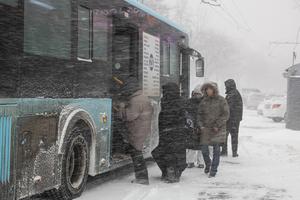 (260110) -- VLADIVOSTOK, 10 enero, 2026 (Xinhua) -- Personas suben a un autobús en medio de una ventisca, en Vladivostok, Rusia, el 10 de enero de 2026. (Xinhua/Andrey Matveenko) (oa) (ra) (ce)