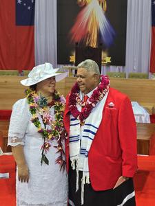 (250916) — APIA, 16 septiembre, 2025 (Xinhua) — Laaulialemalietoa Leuatea Schmidt y su esposa asisten a la ceremonia de juramentación en el Gimnasio Multiusos Tuanaimato, en Apia, Samoa, el 16 de septiembre de 2025. Laaulialemalietoa prestó juramento como nuevo primer ministro de Samoa, comenzando así su mandato de cinco años. (Xinhua/Shi Zujie) (jg) (ra) (ce)