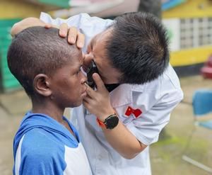 (250822) — FREETOWN, 22 agosto, 2025 (Xinhua) — Imagen del 16 de junio de 2025 de un miembro del 26 grupo del equipo médico chino en Sierra Leona realizando exámenes del fondo de ojo para un huérfano local en el Instituto de Bienestar Infantil de la Fundación Saint George, en Freetown, Sierra Leona. El equipo médico ha completado más de 10.000 tratamientos médicos desde su llegada, incluyendo casi 100 operaciones quirúrgicas muy difíciles y más de 100 rescates de emergencia. Los tipos de cirugías que realizan abarcan diversas áreas, como cirugía general, ortopedia, ginecología y obstetricia. Su amplia experiencia les permite abordar diversos desafíos médicos. (Xinhua/El 26 grupo del equipo médico chino en Sierra Leona) (rtg) (ra)