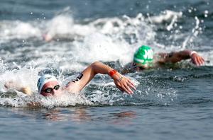 (250720) -- SINGAPUR, 20 julio, 2025 (Xinhua) -- Florian Wellbrock (frente), de Alemania, compite en la final de 4X1500m relevo mixto de aguas abiertas en el Campeonato Mundial de Deportes Acuáticos, en Singapur, el 20 de julio de 2025. (Xinhua/Luo Yuan) (oa) (da)