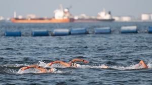 (250720) -- SINGAPUR, 20 julio, 2025 (Xinhua) -- Celine Rieder (i), de Alemania, compite en la final de 4X1500m relevo mixto de aguas abiertas en el Campeonato Mundial de Deportes Acuáticos, en Singapur, el 20 de julio de 2025. (Xinhua/Wu Zhizun) (oa) (da)