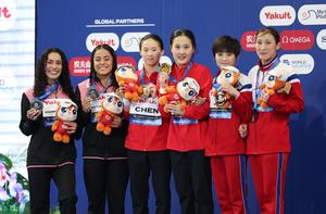 (250728) -- SINGAPUR, 28 julio, 2025 (Xinhua) -- Las medallistas de oro, Chen Yuxi (3-i)/Zhang Minjie (3-d), de China, las medallistas de plata, Alejandra Estudillo Torres (2-i)/Gabriela Agúndez García (i), de México, y las medallistas de bronce, Kim Mi Hwa (d)/Jo Jin Mi, de República Popular Democrática de Corea, posan durante la ceremonia de premiación de la final de 10m sincronizados femeninos de clavados, en el Campeonato Mundial de Deportes Acuáticos, en Singapur, el 28 de julio de 2025. (Xinhua/Luo Yuan) (rtg) (ah) (ce)