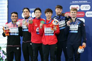 (250728) -- SINGAPUR, 28 julio, 2025 (Xinhua) -- Los medallistas de oro, Wang Zongyuan (3-i)/Zheng Jiuyuan (3-d), de China, los medallistas de plata, Juan Manuel Celaya Hernández (i)/Osmar Olvera Ibarra (2-i), de México, y los medallistas de bronce, Jack Laugher (d)/Anthony Harding, de Reino Unido, posan durante la ceremonia de premiación de la final de 3m sincronizados masculinos de clavados, en el Campeonato Mundial de Deportes Acuáticos, en Singapur, el 28 de julio de 2025. (Xinhua/Luo Yuan) (rtg) (ah) (ce)