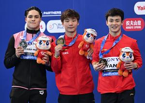(250727) -- SINGAPUR, 27 julio, 2025 (Xinhua) -- El medallista de oro, Zheng Jiuyuan (c), de China, el medallista de plata, Osmar Olvera Ibarra (i), de México y el medallista de bronce, Yan Siyu, de China, posan para fotografías durante la ceremonia de premiación del trampolín 1m masculino de clavados en el Campeonato Mundial de Deportes Acuáticos, en Singapur, el 27 de julio de 2025. (Xinhua/Xue Yuge) (rtg) (da)