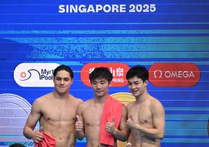 (250727) -- SINGAPUR, 27 julio, 2025 (Xinhua) -- El medallista de oro, Zheng Jiuyuan (c), de China, el medallista de plata, Osmar Olvera Ibarra (i), de México y el medallista de bronce, Yan Siyu, de China, posan para fotografías al término de la final de trampolín 1m masculino de clavados en el Campeonato Mundial de Deportes Acuáticos, en Singapur, el 27 de julio de 2025. (Xinhua/Xue Yuge) (rtg) (da)