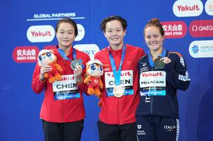 (250802) -- SINGAPUR, 2 agosto, 2025 (Xinhua) -- La medallista de oro Chen Yiwen (c), de China, la medallista de plata Chen Jia (i), de China, y la medallista de bronce Chiara Pellacani, de Italia, posan durante la ceremonia de premiación para la final de trampolín 3m femenino de clavados en el Campeonato Mundial de Deportes Acuáticos, en Singapur, el 2 de agosto de 2025. (Xinhua/Wu Zhizun) (rtg) (da)
