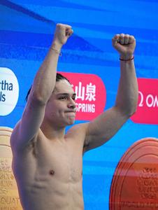 (250801) -- SINGAPUR, 1 agosto, 2025 (Xinhua) -- Osmar Olvera Ibarra, de México, festeja al término de la final de trampolín 3m masculino de clavados en el Campeonato Mundial de Deportes Acuáticos, en Singapur, el 1 de agosto de 2025. (Xinhua/Xue Yuge) (rtg) (ra)