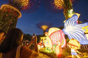 (250922) -- SINGAPUR, 22 septiembre, 2025 (Xinhua) -- Una turista toma fotografías de las decoraciones de linternas del Festival de Medio Otoño celebrada en los Jardines de la Bahía, en Singapur, el 22 de septiembre de 2025. (Xinhua/Then Chih Wey) (oa) (ah) (vf)