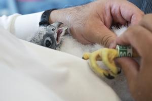 (260314) -- SINGAPUR, 14 marzo, 2026 (Xinhua) -- Un trabajador de la Junta de Parques Nacionales de Singapur (NParks) coloca una anilla en una pata de un polluelo de halcón peregrino durante una operación de marcaje y recopilación de datos en el OCBC Center, en Singapur, el 14 de marzo de 2026. El personal de NParks de Singapur colocó anillas a cuatro polluelos de halcón peregrino en el OCBC Center del centro de la ciudad el sábado para rastrear sus movimientos, su esperanza de vida y patrones de reproducción. (Xinhua/Then Chih Wey) (jg) (ra) (da)