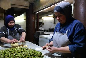 (250328) -- DAMASCO, 28 marzo, 2025 (Xinhua) -- Imagen del 27 de marzo de 2025 de dos mujeres sirias rellenando masa con pistachos triturados mientras preparan galletas maamoul en un taller tradicional, en Damasco, Siria. A medida que se acerca el Eid al-Fitr, las panaderías de Damasco están ocupadas preparando maamoul y otros dulces hechos con harina de trigo y rellenos de pistachos, nueces o dátiles. (Xinhua/Ammar Safarjalani) (oa) (ra) (vf)