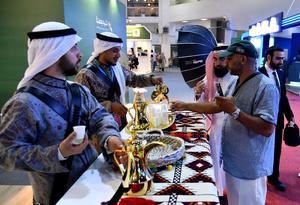(250829) -- DAMASCO, 29 agosto, 2025 (Xinhua) -- Imagen del 27 de agosto de 2025 de expositores sirviendo café árabe a los visitantes en la 62 Feria Internacional de Damasco, en Damasco, Siria. La feria se celebra del 27 de agosto al 5 de septiembre. (Xinhua/Ammar Safarjalani) (jg) (da) (vf)