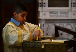 (260330) -- DAMASCO, 30 marzo, 2026 (Xinhua) -- Imagen del 29 de marzo de 2026 de un devoto encendiendo velas durante los servicios del Domingo de Ramos en una iglesia, en Damasco, Siria. El Domingo de Ramos es una festividad cristiana que se celebra el domingo anterior a la Pascua y marca el inicio de la Semana Santa. (Xinhua/Ammar Safarjalani) (oa) (ah) (vf)