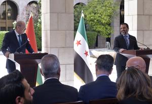 (250521) -- DAMASCO, 21 mayo, 2025 (Xinhua) -- Imagen del 20 de mayo de 2025 del ministro de Asuntos Exteriores sirio, Asaad al-Shibani (d-atrás), y el vice primer ministro y ministro de Relaciones Exteriores jordano, Ayman Safadi (i-atrás), asistiendo a una conferencia de prensa conjunta, en Damasco, Siria. Siria y Jordania firmaron el martes un memorando de entendimiento para establecer un consejo de coordinación destinado a fortalecer la cooperación bilateral. El acuerdo fue firmado en Damasco por el ministro de Asuntos Exteriores sirio, Asaad al-Shibani, y el vice primer ministro y ministro de Relaciones Exteriores jordano, Ayman Safadi. (Xinhua/Ammar Safarjalani) (jg) (da) (ce)