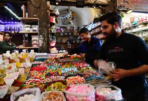 (250324) -- DAMASCO, 24 marzo, 2025 (Xinhua) -- Imagen del 23 de marzo de 2025 de personas comprando dulces coloridos y mercancía tradicional en el mercado histórico al-Buzuriyah, en Damasco, Siria. (Xinhua/Ammar Safarjalani) (rtg) (ah) (ce)