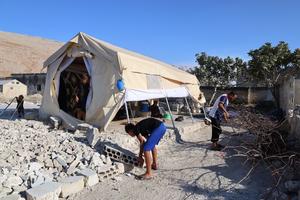 (250819) — HAMA, 19 agosto, 2025 (Xinhua) — Imagen del 13 de agosto de 2025 de personas vistas cerca de una tienda de campaña montada sobre los escombros, en la aldea de al-Hawash, en la provincia de Hama, en el centro de Siria. Al-Hawash, que en su día fue una modesta comunidad agrícola en la campiña de Hama, se ha convertido en un cementerio de hormigón roto y barras de acero retorcidas. Donde antes los niños jugaban en los patios, ahora se balancean sobre los restos destrozados de los techos derrumbados. Las familias transportan piedras recuperadas en cubos y carretillas para delimitar los espacios donde instalar sus tiendas de campaña, colocadas entre muros destrozados y vigas precarias. (Xinhua/Str) (oa) (ah) (vf)