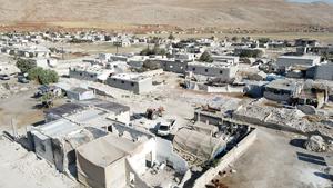 (250819) — HAMA, 19 agosto, 2025 (Xinhua) — Imagen tomada con un dron el 13 de agosto de 2025 de tiendas de campaña improvisadas entre casas destruidas, en la aldea de al-Hawash, en la provincia de Hama, en el centro de Siria. Al-Hawash, que en su día fue una modesta comunidad agrícola en la campiña de Hama, se ha convertido en un cementerio de hormigón roto y barras de acero retorcidas. Donde antes los niños jugaban en los patios, ahora se balancean sobre los restos destrozados de los techos derrumbados. Las familias transportan piedras recuperadas en cubos y carretillas para delimitar los espacios donde instalar sus tiendas de campaña, colocadas entre muros destrozados y vigas precarias. (Xinhua/Str) (oa) (ah) (vf)