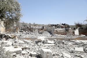 (250814) -- IDLIB, 14 agosto, 2025 (Xinhua) -- Rescatistas y residentes buscan entre los escombros tras una explosión, en Idlib, Siria, el 14 de agosto de 2025. Una potente explosión sacudió el jueves la zona rural de la provincia siria de Idlib, matando al menos a cuatro personas e hiriendo a otras cinco, de acuerdo con medios de comunicación estatales sirios y un grupo de seguimiento de la guerra. (Xinhua/Str) (jg) (ah) (ce)