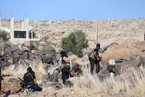 (250719) -- SWEIDA, 19 julio, 2025 (Xinhua) -- Imagen del 18 de julio de 2025 de combatientes tribales tomando posiciones durante enfrentamientos, en el poblado de Wolgha, en la campiña occidental de Sweida, en el sur de Siria. Las autoridades interinas de Siria exhortaron el viernes a la moderación en medio de una creciente violencia en la provincia meridional de Sweida y prometieron desplegar fuerzas para contener el conflicto. (Xinhua/Str) (oa) (da)