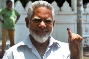 (250506) -- COLOMBO, 6 mayo, 2025 (Xinhua) -- Un elector muestra su dedo pintado después de votar cerca de un centro de votación, en Colombo, Sri Lanka, el 6 de mayo de 2025. Sri Lanka celebró el martes por primera vez en siete años unas elecciones locales a nivel nacional largamente postergadas. Las elecciones se consideran una prueba de fuego para la popularidad del Gobierno. De acuerdo con la comisión electoral, los electores pueden votar para elegir a 8.287 miembros de 339 órganos de gobierno local, que incluyen 28 consejos municipales, 36 consejos urbanos y 275 pradeshiya sabhas. (Xinhua/Gayan Sameera) (jg) (ra) (vf)
