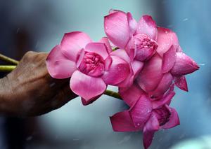 (250611) -- KELANIYA, 11 junio, 2025 (Xinhua) -- Imagen del 10 de junio de 2025 de un loto en la mano de un budista en el Día de Poson Poya, en Kelaniya, Sri Lanka. El Día de Poson Poya celebra la llegada del budismo a Sri Lanka. (Xinhua/Ajith Perera) (ra) (vf)