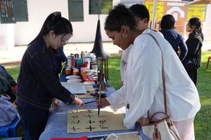 (250417) — CIUDAD DEL CABO, 17 abril, 2025 (Xinhua) — Una mujer aprende caligrafía china en el evento del Día Internacional del Idioma Chino 2025, en Ciudad del Cabo, Sudáfrica, el 17 de abril de 2025. Una celebración vibrante para conmemorar el Día Internacional del Idioma Chino 2025, con el tema «Idioma chino: Juntos por un futuro brillante», se llevó a cabo el jueves en el Centro de Aprendizaje Iziko de Ciudad del Cabo. (Xinhua/Wang Lei) (jg) (ah) (vf)