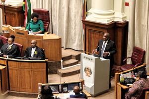 (251015) -- CIUDAD DEL CABO, 15 octubre, 2025 (Xinhua) -- Imagen del 14 de octubre de 2025 del presidente de Sudáfrica, Cyril Ramaphosa, hablando mientras responde a preguntas en el Consejo Nacional de Provincias, en el Parlamento, en Ciudad del Cabo, Sudáfrica. Ramaphosa dijo el martes que aunque el reciente acuerdo de paz para Gaza es bienvenido, esto no afecta el caso del país en contra de Israel en la Corte Internacional de Justicia. (Xinhua/Shakirah Thebus) (jg) (da) (ce)