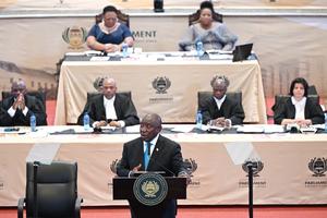 (260213) -- CIUDAD DEL CABO, 13 febrero, 2026 (Xinhua) -- Imagen del 12 de febrero de 2026 del presidente sudafricano, Cyril Ramaphosa (frente), pronunciando el Discurso sobre el Estado de la Nación en el Ayuntamiento de Ciudad del Cabo, en Ciudad del Cabo, Sudáfrica. Ramaphosa anunció el jueves la decisión de desplegar al Ejército para ayudar a combatir el crimen organizado, al que describió como la amenaza más inmediata a la que se enfrenta el país. (Xinhua/Xabiso Mkhabela) (oa) (ra) (vf)