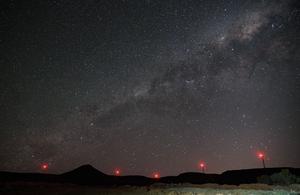 (251028) -- DE AAR, 28 octubre, 2025 (Xinhua) -- Imagen del 22 de octubre de 2025 de luces de las turbinas eólicas del Proyecto de Energía Eólica De Aar vistas bajo el cielo estrellado, en De Aar, Cabo Septentrional, Sudáfrica. Para impulsar el desarrollo ecológico de África, China ha ayudado a varios países a construir proyectos de energía limpia. (Xinhua/Han Xu) (oa) (ah) (ce)