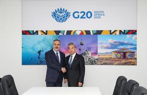 (250221) -- JOHANNESBURGO, 21 febrero, 2025 (Xinhua) -- El ministro de Relaciones Exteriores chino, Wang Yi, también miembro del Buró Político del Comité Central del Partido Comunista de China, se reúne con el ministro de Relaciones Exteriores de Turquía, Hakan Fidan, al margen de la Reunión de Ministros de Relaciones Exteriores del G20, en Johannesburgo, Sudáfrica, el 20 de febrero de 2025. (Xinhua/Zhang Yudong) (jg) (da) (ce)
