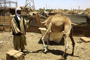 (250603) -- OMDURMAN, 3 junio, 2025 (Xinhua) -- Imagen del 2 de junio de 2025 de un vendedor exhibiendo un camello en un mercado de ganado previo a festival musulmán de Eid al-Adha, o Fiesta del Sacrificio, en la ciudad de Omdurman, Sudán. (Xinhua/Mohamed Khidir) (jg) (ra) (vf)
