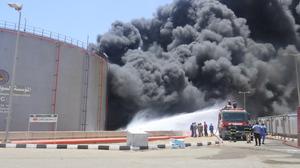 (250505) -- PUERTO DE SUDAN, 5 mayo, 2025 (Xinhua) -- Bomberos combaten un incendio después de un ataque con drones a un depósito de combustible, en el Puerto de Sudán, en el este de Sudán, el 5 de mayo de 2025. Las Fuerzas de Apoyo Rápido paramilitares de Sudán han intensificado recientemente los ataques con drones en zonas controladas por el Ejército sudanés, un hecho que los expertos militares consideran una peligrosa escalada en su conflicto en curso. (Xinhua/Ministerio Sudanés de Energía y Petróleo) (ah) (vf)