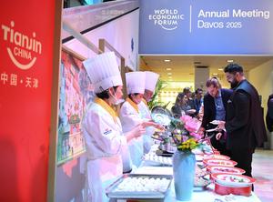 (250122) -- DAVOS, 22 enero, 2025 (Xinhua) -- Imagen del 21 de enero de 2025 de participantes degustando bolas de masa hervida en una recepción celebrada por la ciudad de Tianjin de China durante la Reunión Anual 2025 del Foro Económico Mundial (FEM), en Davos, Suiza. Tianjin, la ciudad anfitriona del Davos de Verano 2025 (Reunión Anual de los Nuevos Campeones), celebró la recepción aquí el martes por la noche con motivo del próximo Festival de Primavera chino, o el Año Nuevo Lunar chino. (Xinhua/Lian Yi) (jg) (da) (vf)