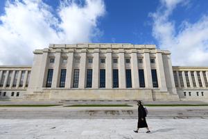 (251025) -- GINEBRA, 25 octubre, 2025 (Xinhua) -- Imagen del 24 de octubre de 2025 de un hombre caminando frente al Palacio de las Naciones, en Ginebra, Suiza. Una exposición fotográfica titulada "Vidas Compartidas, Futuro Compartido" para conmemorar el 80 aniversario de la Organización de las Naciones Unidas fue inaugurada aquí en el Palacio de las Naciones el viernes, coincidiendo con el Día de las Naciones Unidas. La exposición presentó 27 historias que muestran cómo las Naciones Unidas hicieron una diferencia en la vida cotidiana de las personas, desde la promoción de la paz y la seguridad hasta la prestación de ayuda humanitaria. (Xinhua/Lian Yi) (oa) (da)