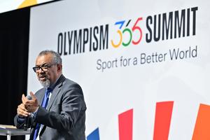 (250605) -- LAUSANA, 5 junio, 2025 (Xinhua) -- Imagen del 4 de junio de 2025 del director general de la Organización Mundial de la Salud, Tedros Adhanom Ghebreyesus, hablando durante la primera Cumbre Olimpismo365, en Lausana, Suiza. (Xinhua/Christophe Moratal/COI) (rtg) (ra) (ce)