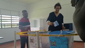 (250525) -- PARAMARIBO, 25 mayo, 2025 (Xinhua) -- Imagen cedida por Suriname Herald de Jennifer Simons (c), candidata presidencial y presidenta del Partido Nacional Democrático, emitiendo su voto en un colegio electoral durante las elecciones presidenciales, en Paramaribo, capital de Surinam, el 25 de mayo de 2025. (Xinhua/Suriname Herald) (oa) (da)