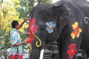 (250410) -- AYUTTHAYA, 10 abril, 2025 (Xinhua) -- Un hombre pinta un elefante para celebrar el próximo festival Songkran, en Ayutthaya, Tailandia, el 10 de abril de 2025. El festival Songkran, el tradicional Año Nuevo tailandés, se celebra anualmente del 13 al 15 de abril, durante el cual las personas se saludan salpicándose agua. (Xinhua/Rachen Sageamsak) (da) (ra) (vf)