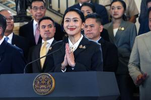 (250829) -- BANGKOK, 29 agosto, 2025 (Xinhua) -- Paetongtarn Shinawatra (c) habla con la prensa en la sede del Gobierno, en Bangkok, Tailandia, el 29 de agosto de 2025. El Tribunal Constitucional de Tailandia destituyó el viernes a la suspendida primera ministra Paetongtarn Shinawatra por violar la Constitución debido a su conversación telefónica con Camboya sobre la cuestión fronteriza. (Xinhua/Rachen Sageamsak) (jg) (da) (vf)