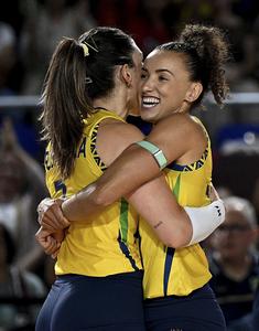 (250825) -- CHIANG MAI, 25 agosto, 2025 (Xinhua) -- Imagen del 24 de agosto de 2025 de Gabriela Braga Guimaraes (d), de Brasil, festejando un punto con su compañera Rosamaria Montibeller durante el partido del grupo C de la fase preliminar entre Brasil y Francia, en el Campeonato Mundial de Voleibol Femenino, en Chiang Mai, Tailandia. (Xinhua/Hou Zhaokang) (oa) (ah) (vf)