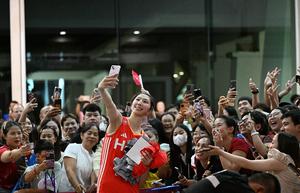 (250827) -- CHIANG MAI, 27 agosto, 2025 (Xinhua) -- Wu Mengjie (frente), de China, posa con aficionados al término del partido del grupo F de la fase preliminar entre China y República Dominicana en el Campeonato Mundial de Voleibol Femenino, en Chiang Mai, Tailandia, el 27 de agosto de 2025. (Xinhua/Hou Zhaokang) (ah) (ra)