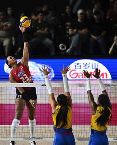 (250823) -- CHIANG MAI, 23 agosto, 2025 (Xinhua) -- Gaila Ceneida González López (i), de República Dominicana, clava el balón durante el partido del grupo F de la fase preliminar entre República Dominicana y Colombia, en el Campeonato Mundial de Voleibol Femenino, en Chiang Mai, Tailandia, el 23 de agosto de 2025. (Xinhua/Hou Zhaokang) (rtg) (da)
