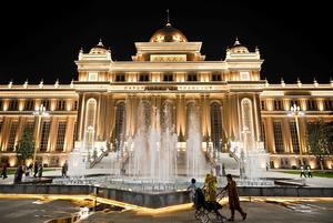 (250824) -- DUSAMBE, 24 agosto, 2025 (Xinhua) -- Imagen del 23 de agosto de 2025 de una vista nocturna del edificio del Parlamento, en Dusambé, Tayikistán. Dusambé es la capital de Tayikistán, así como el centro económico y cultural del país. (Xinhua/Li Renzi) (oa) (da)